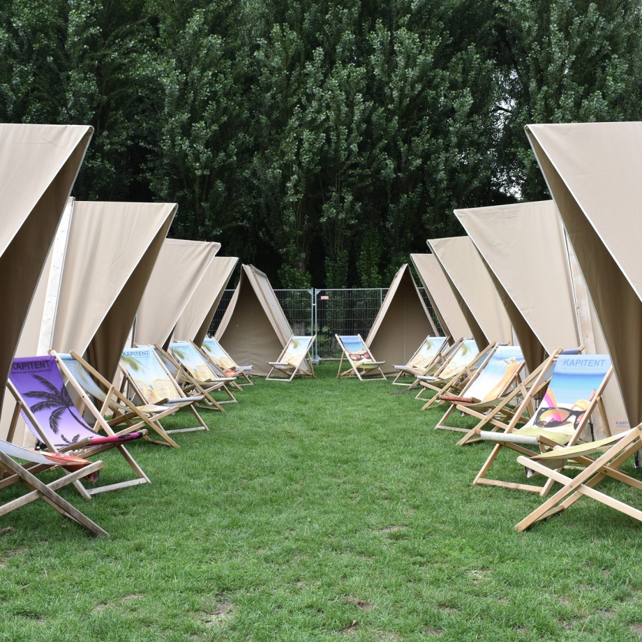 Luxe tent: Wij zorgen voor alles. Je hoeft niets mee te brengen. Alles kant en klaar in je eigen hippe slaapunit: matrasje opgemaakt met kussens, donsdeken, vergezeld van een nachtlampje, maar ook een terrasje met luifel en 2 beach chairs.